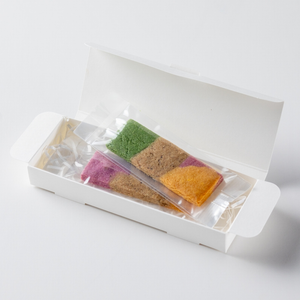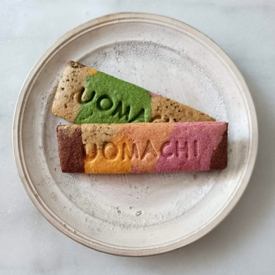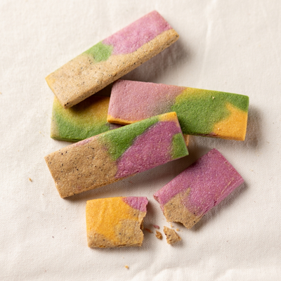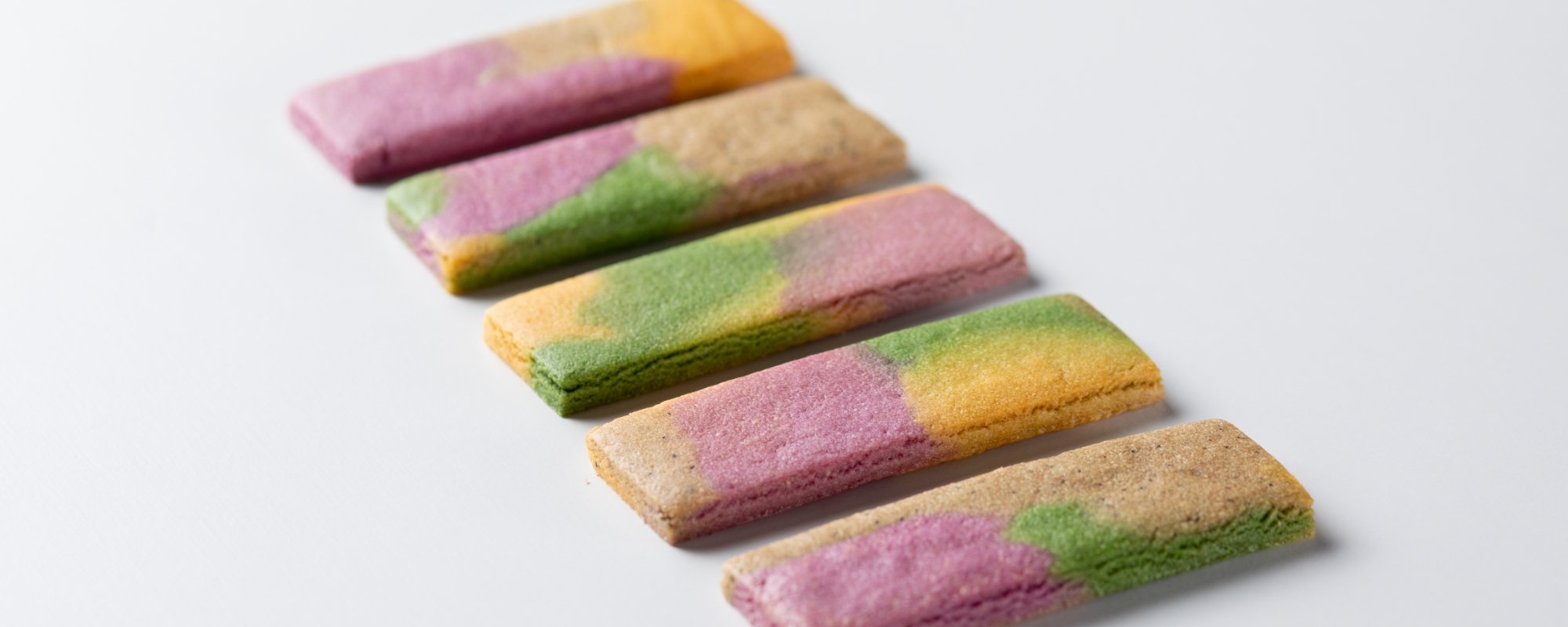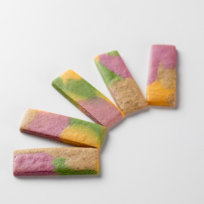 「カラフルクッキー」は、北九州市のお土産「区ッキー」と同じ生地を使用しています。アーモンドパウダーを使ったコクのある生地を焼き上げ、カラフルな色合いは野菜や果物のパウダーで自然に色付けしています。合成着色料を一切使用していないので、安心してお召し上がりいただけます。